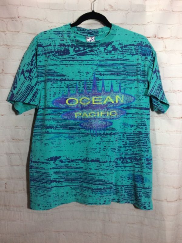 1990’s Ocean Pacific/OP T-shirt, short sleeves, button-up, 2 toned, static graphic print, screen printed full front design, Saved By The Bell, teal/blue/yellow, size L