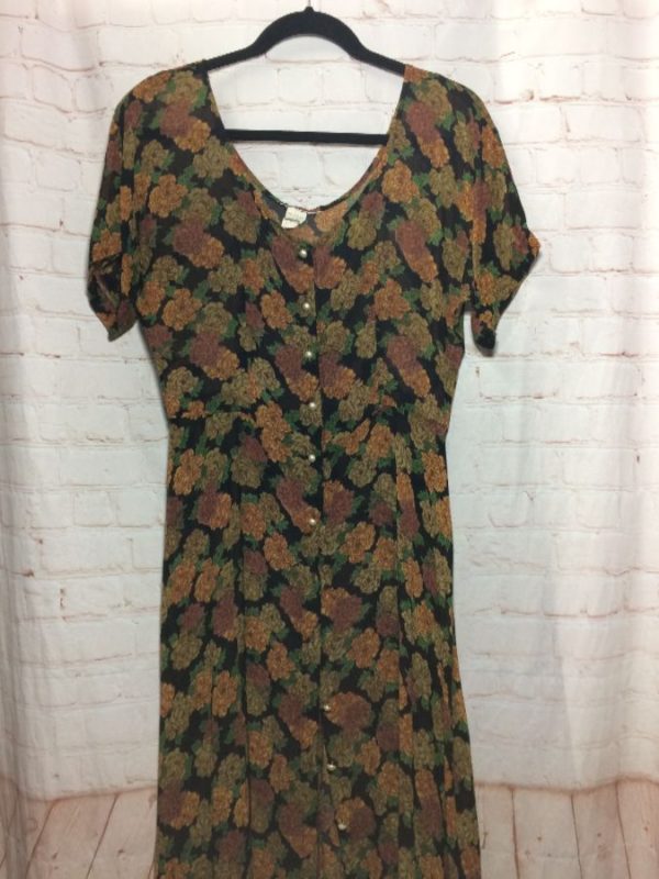 1990’s dress, rayon, short sleeves, button-up, long length, fall floral pattern, green/peach/red-violet/gray/purple black, size one size fits all