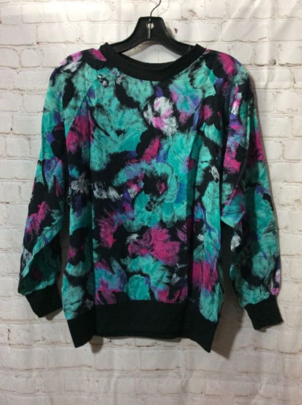 1990’s Stringbean top, pullover, rayon, long sleeves, crew neck, floral print design, contrasting neck/cuffs/hem, teal/pink/black/purple, size M