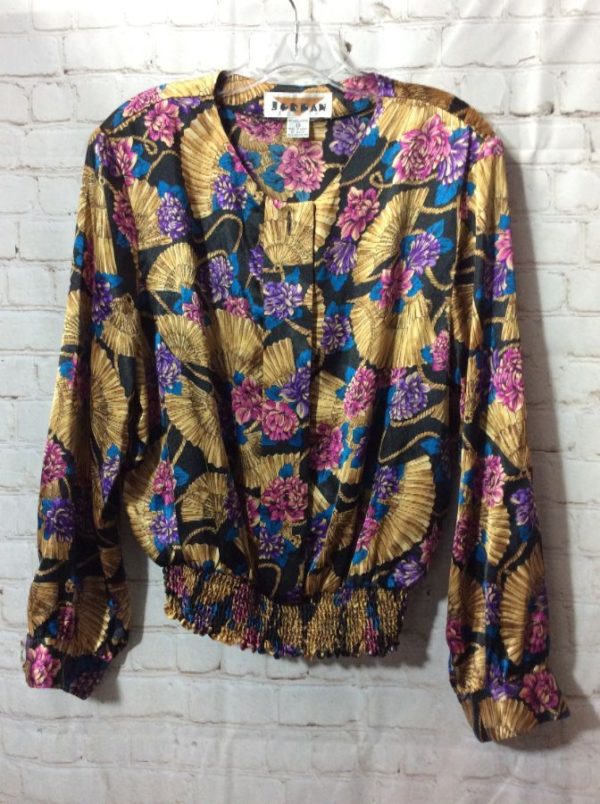 1990’s retro Jordan blouse, polyester, long sleeves, button-up, floral & fan print, elastic gathered hem, gold/black/pink/purple/blue, size 14