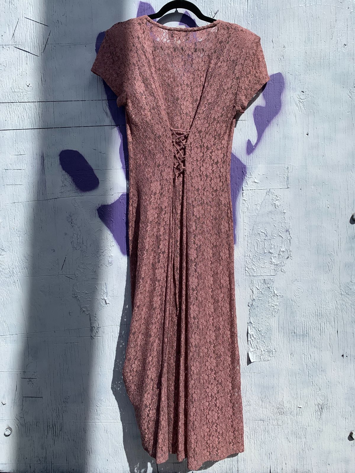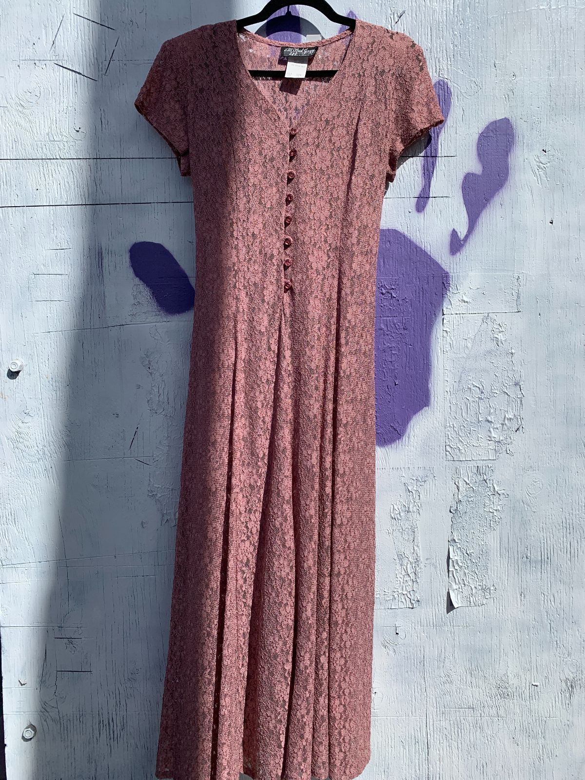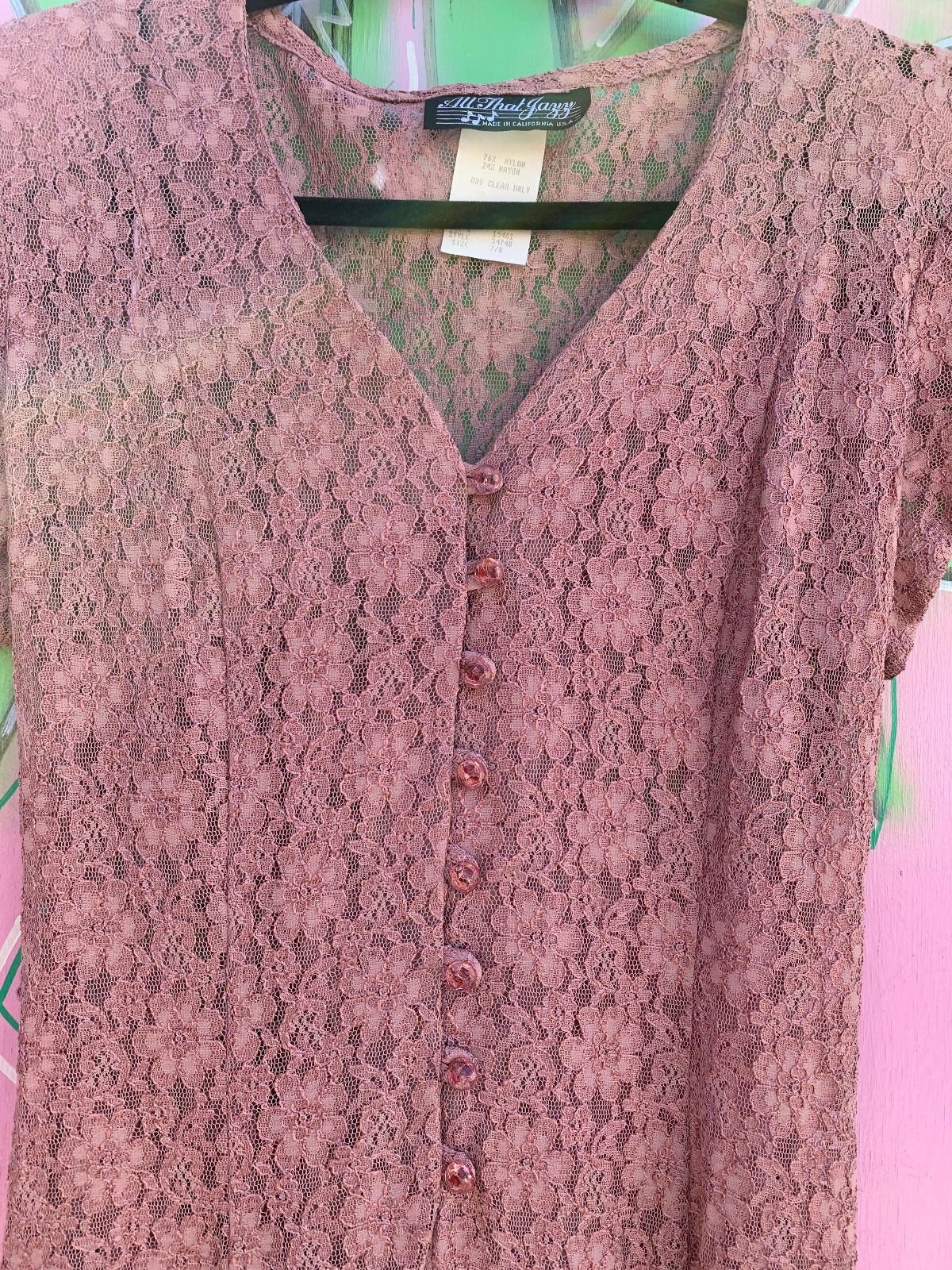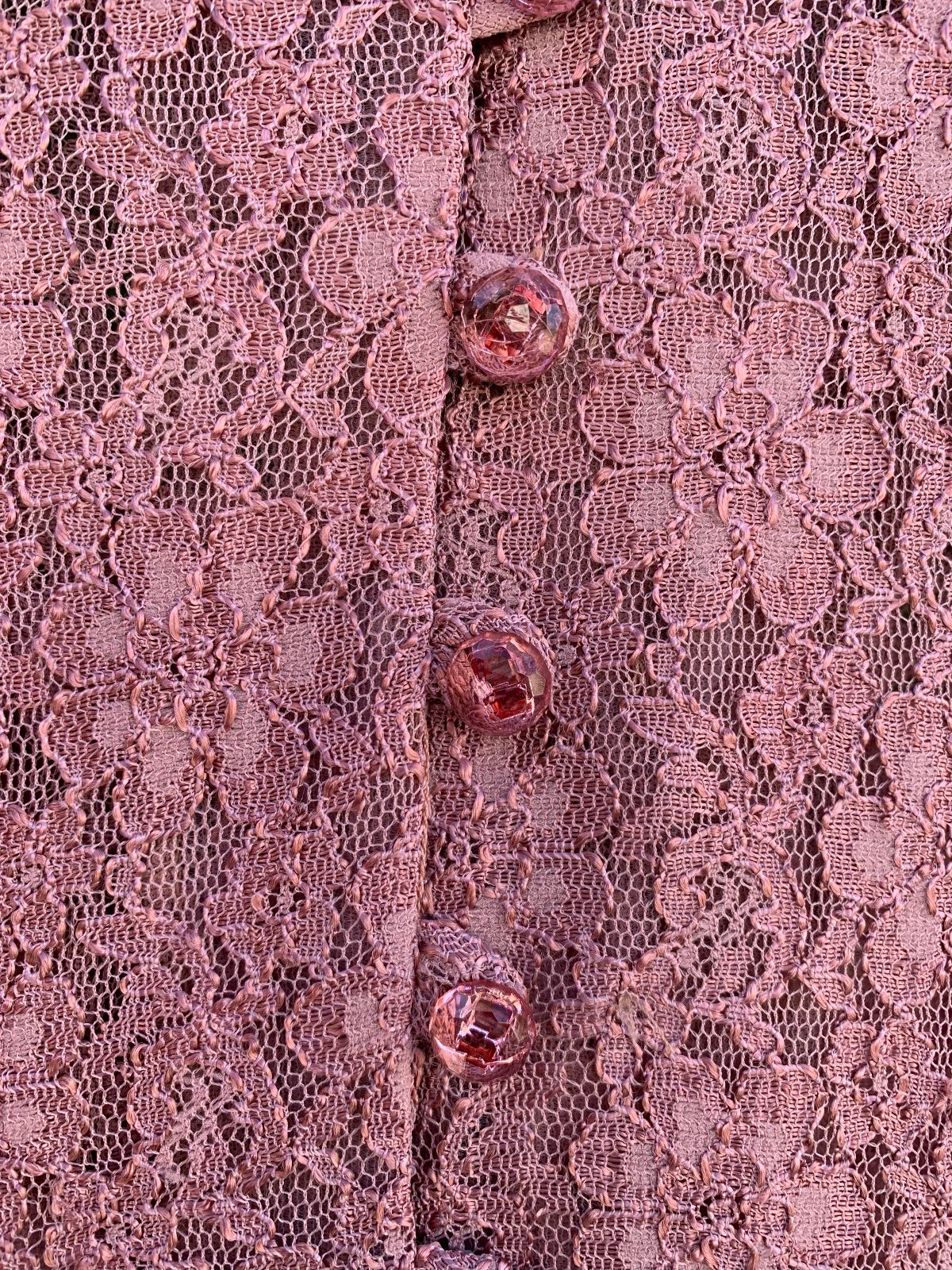 1990S SHEER LACE SHORT SLEEVE BUTTON FRONT MAXI DRESS, LACE UP BACK, FACETED BUTTONS