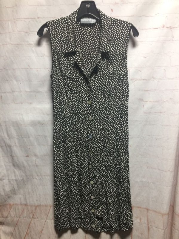 1990’s Carol Anderson dress, sleeveless, button-up full length with opal buttons, collar, polka dot pattern, black/white, size 8 As is