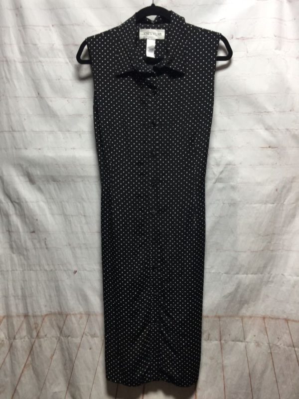 1990’S JONES WEAR DRESS, RAYON, SLEEVELESS, FULLY BUTTON-UP, TIED IN BACK, COLLAR, POLKA DOT PRINT, BLACK/WHITE, SIZE M