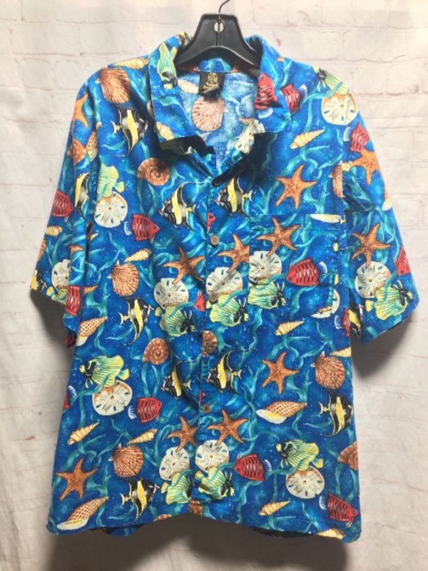 1990’S AQUARIUM TYPE FISH & SHELL PRINT HAWAIIAN SHIRT