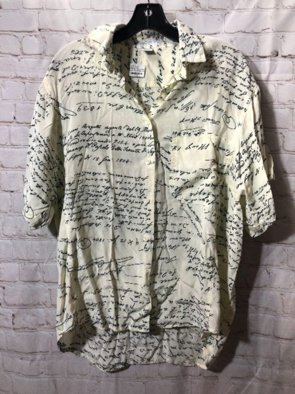 1990’s Express shirt, rayon, short sleeves, button-up, collar, cursive writing graphic print, creme/black, size L
