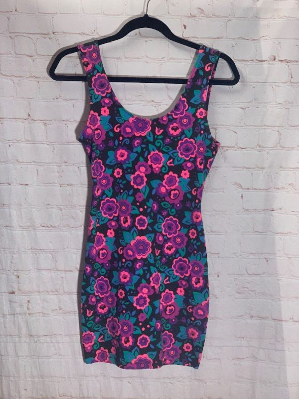 1990’s Workshop Clothing dress, body-con style, stretch fit, floral print design, day-glo colors, pink/purple/teal/black, size M