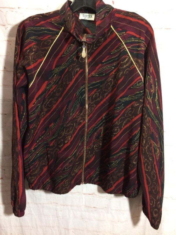 1990’S Teddi windbreaker jacket, zip-up, diagonal piping on front shoulders, swirl & diagonal stripes pattern, burgundy/black/gold, size M