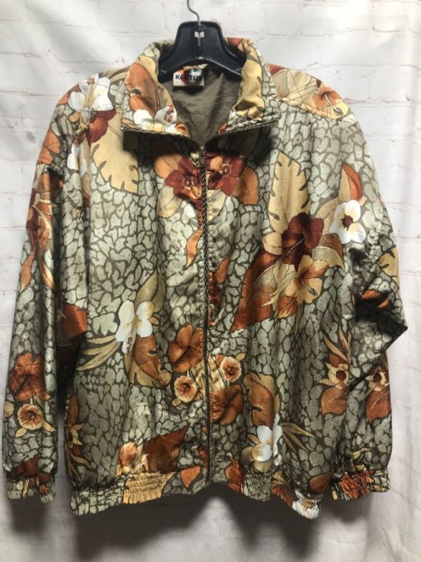 1990’s Kaktus bomber jacket, silky, zip-up, tropical floral crackle print, white/gray/beige/tan/brown, size M