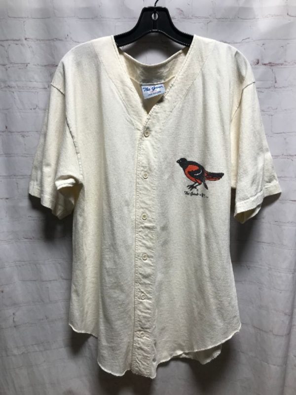 1994 The Game baseball jersey, cotton, short sleeves, button-up, v-neck, Baltimore Orioles, screen printed small team logo left chest, creme/orange/black, size L