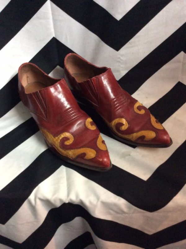 Cowboy boots, low top Winklepickers, 2-toned, snake skin cutouts, ox blood red/golden brown, size 7.5