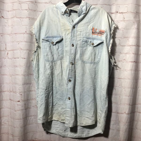 Biker’s Edge denim shirt, cut-off sleeves, button-up, Laconia Weirs Beach, 2006 Bikers Week, screen printed graphic of biker bar full back design, pale blue/brown/yellow/orange/multi, size L As is