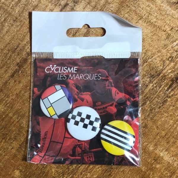Buzz Works button badges, Le Cyclisme Les Marques series, 3 pack, checkered/stripes/block designs, white/black/yellow/red/gray/blue