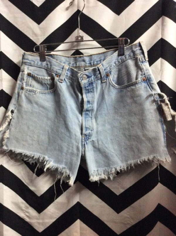 Levis denim shorts, cut-off, 501, red tab, super high side slits, acid wash, pale blue, size 34″W