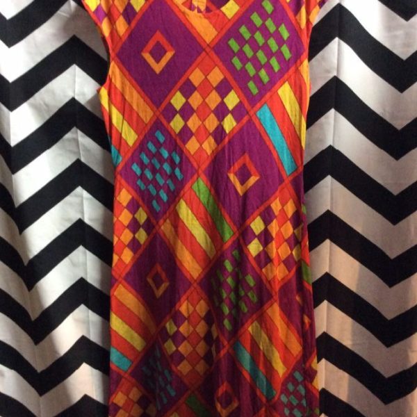 1960’S DRESS – SLEEVELESS – BRIGHT COLORS – GEOMETRIC SQUARES DESIGN PRINT