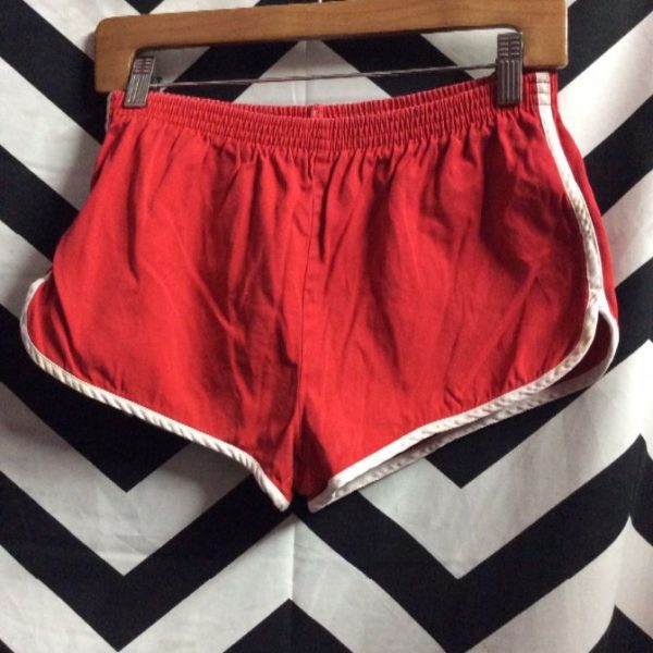 1970’s vintage, running shorts, elastic waist, contrasting trim, red/white, size M