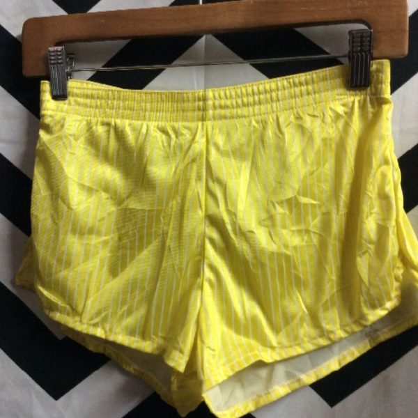 1970’s vintage running shorts, elastic waist, thin vertical stripes, yellow/white, size S