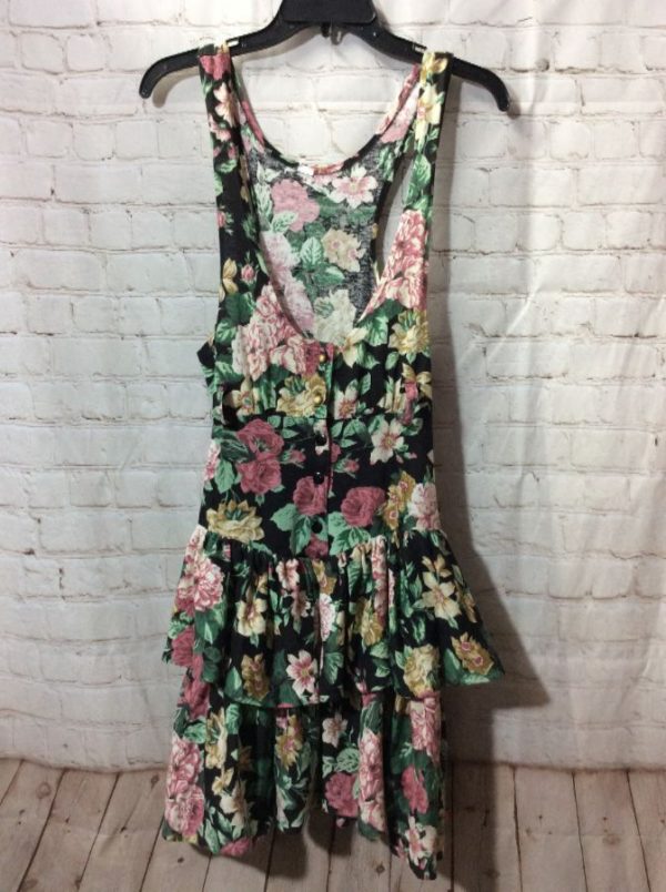 JUMPER DRESS FLORAL PRINT W/ SHELL BUTTONS ON STRAPS & FRONT POCKET