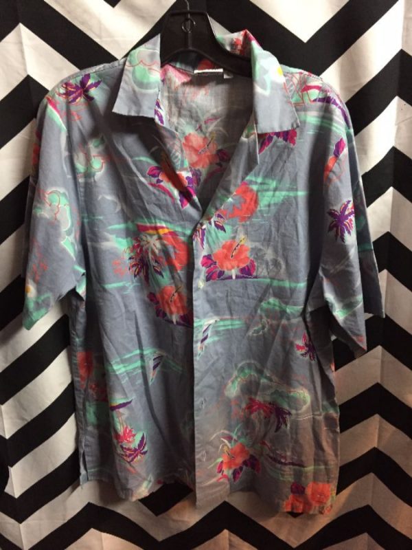 VIBRANT NEON HAWAIIAN SCENE PRINT SHORT SLEEVE BUTTON UP SHIRT
