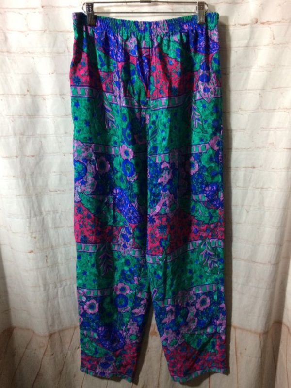 1980’s jogger pants, silky, elastic waist, bold colored floral pattern, purple/teal/blue/pink, size S/M