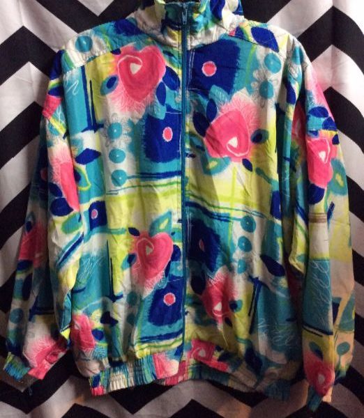 1990’s windbreaker jacket, zip-up, abstract graphic design, day-glow colors, white/teal/pink/blue, size XL