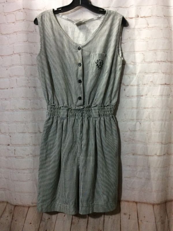1990’s Evita romper, cotton, sleeveless, button-up, elastic waist, seersucker look, vertical striped pattern, embroidered left pocket design, black/white, size L
