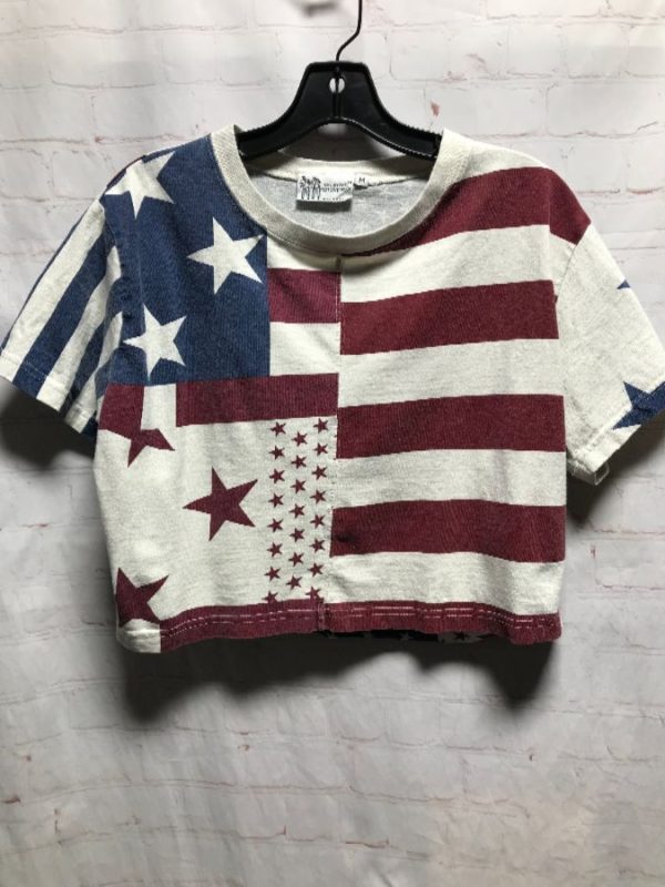 US BOYS NONSTOP WEAR TOP, CROPPED, PULLOVER, SHORT SLEEVES, RINGED NECK, ABSTRACT AMERICAN FLAG DESIGN, RED/WHITE/BLUE, SIZE M