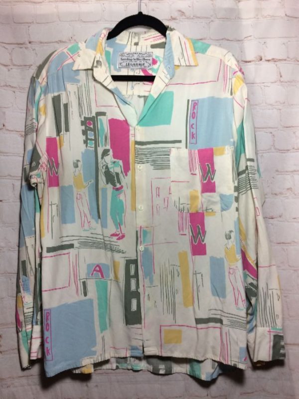 Bellows Brut Le Garage shirt, long sleeves, button-up, collar, abstract print, pastel colors, front pocket, white/teal/baby-blue/pink/yellow, size M
