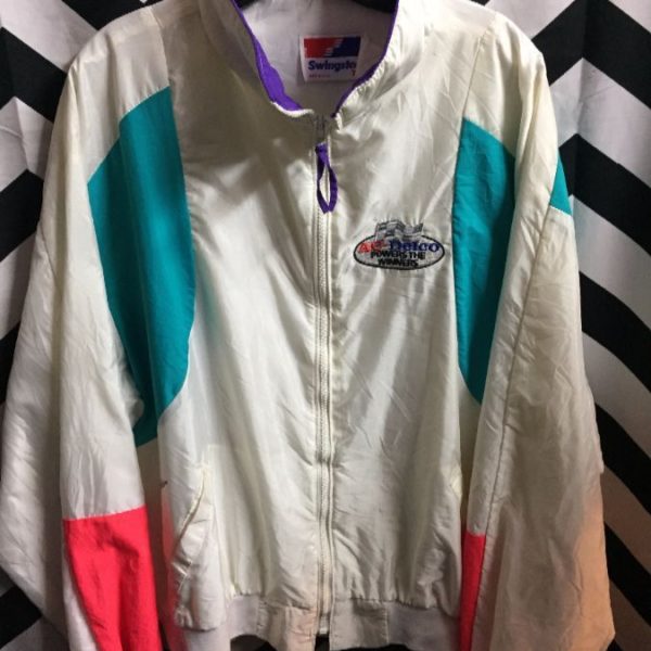 Swingster windbreaker jacket, zip-up, AC Delco, color block design, neon colors, embroidered logo, white/turq/neon-pink, size XL