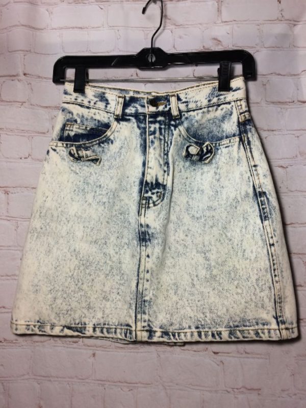 Crayon denim skirt, cotton, zip-up, mini length, front & back pockets with decorative bows, acid wash, pale blue, size 25W x 17L
