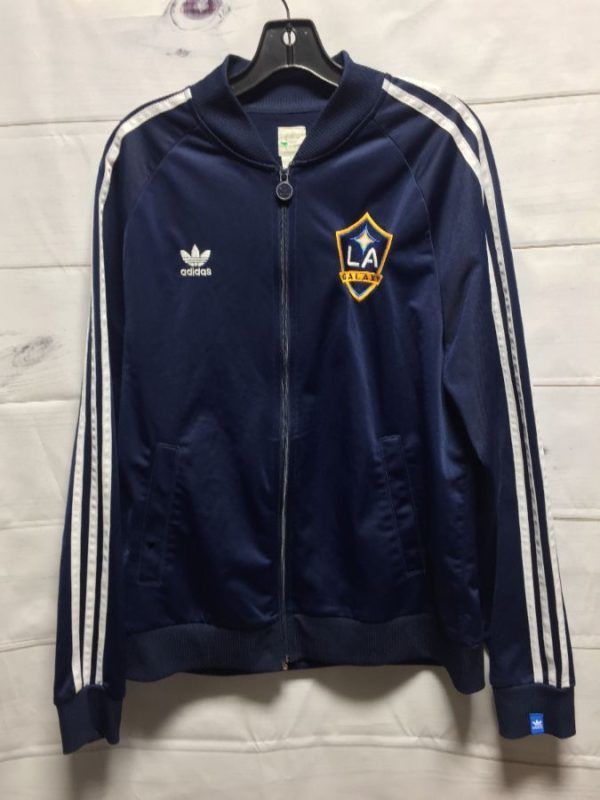 Adidas track jacket, zip-up, stripes down outside of sleeves, LA Galaxy, embroidered trefoil logo & shield, blue/white/yellow, size M