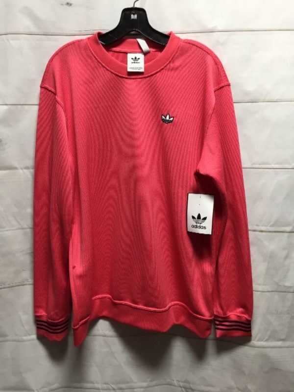 Adidas sweatshirt, pullover, long sleeves, active-wear, light weight, striped cuffs, small left chest embroidered tri-fold logo, NWT, pink, size M