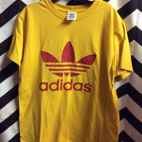 Adidas t-shirt, screen printed logo front & back, yellow/red, size S