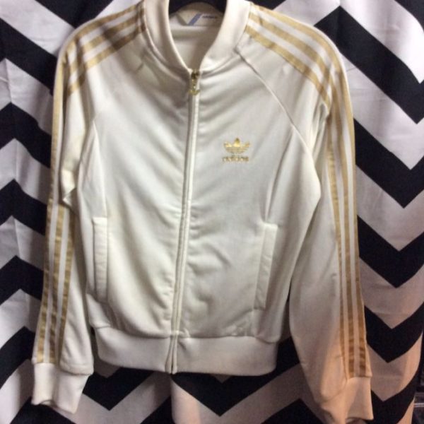 Adidas track jacket, zip-up, embroidered left chest and full back designs, decorative trim, white/gold, size S