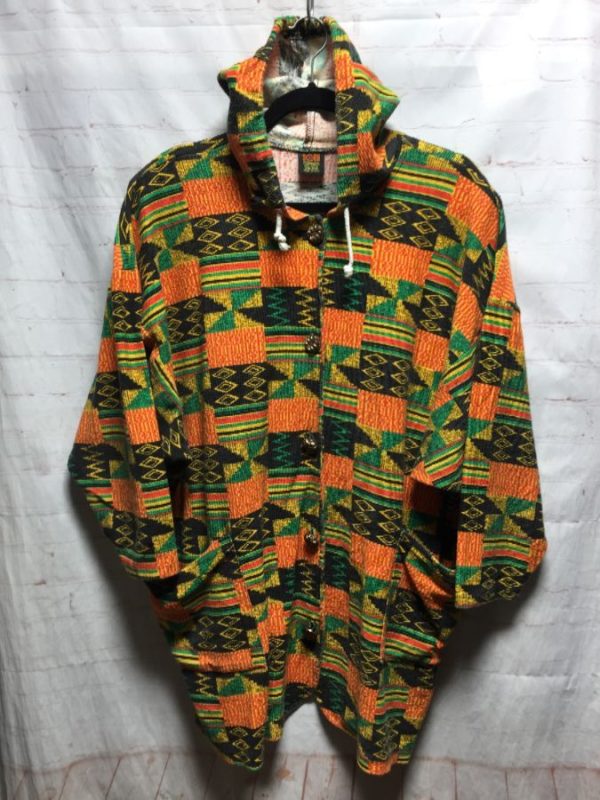 AFRICAN ETHNIC PATTERN HOODED TEXTILE JACKET 3/4 SLEEVE