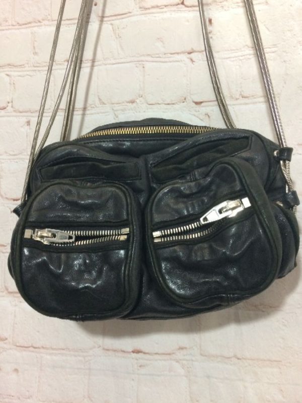 ALEXANDER WANG BRENDA BAG, LEATHER, SUPER SOFT, MULTIPLE ZIPPERED COMPARTMENTS & 2 OUTSIDE POCKETS, MULTIPLE CHAINS, LEATHER HAND GRIP WITH ZIPPER, BLACK/SILVER