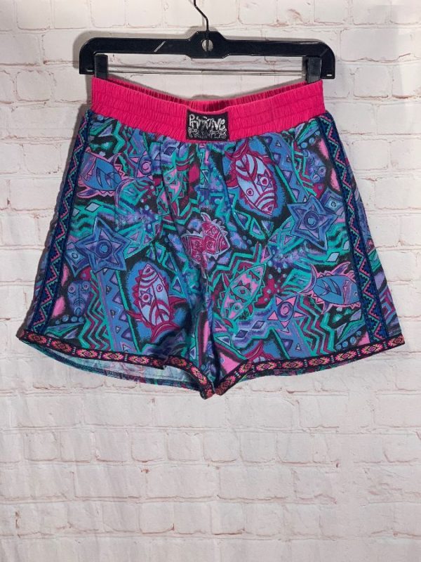1990’s Primitive Prints shorts, boxing style, elastic waist, made in USA, fish & tribal all over pattern with solid color waist band, hot pink/blue/turquoise black/purple/pale pink, size L