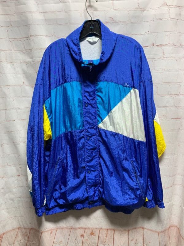 1990’s Christian Dior windbreaker jacket, button-up, color-block design, teal/royal blue/yellow/white, size L