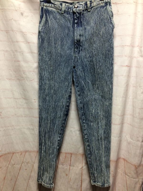 1980’s Pizzaazz jeans, zip-up, tiny polka dot pattern, crinkled lightning acid wash, amazing, dead-stock, NOS, NWT, medium blue, size 27W