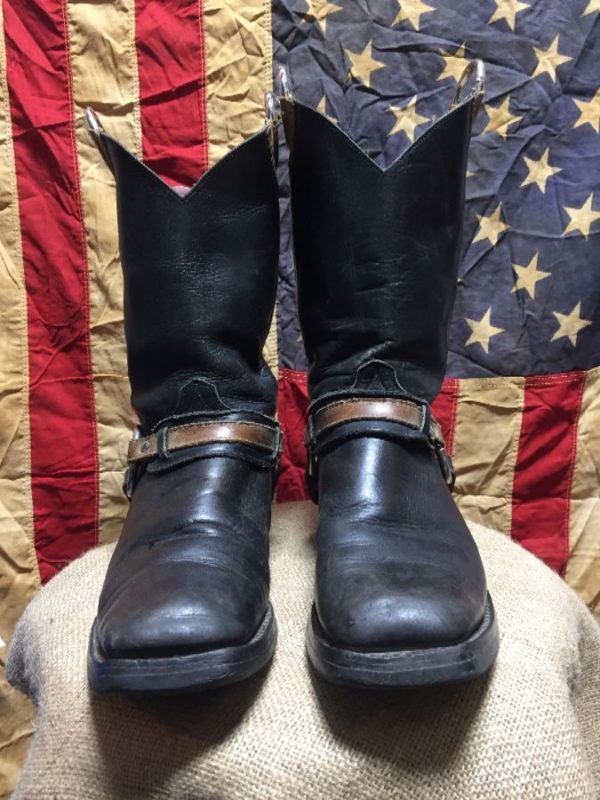 Biker harness boots, leather, high tops, squared toes, O-rings on harness & upper pulls, amazing, black/brown