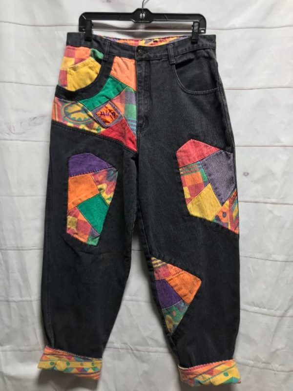 1990’s rare Paco pants, baggy, funky prints in patchwork color-block designs, amazing, black, size 34