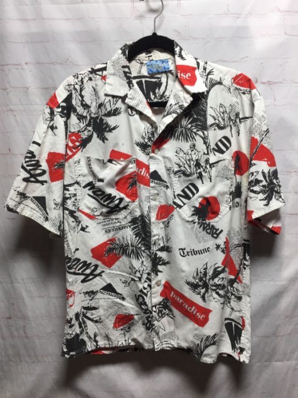 VINTAGE COTTON W/ ISLAND PARADISE NEWSPAPER ARTICLE CLIPPINGS PRINT SHIRT