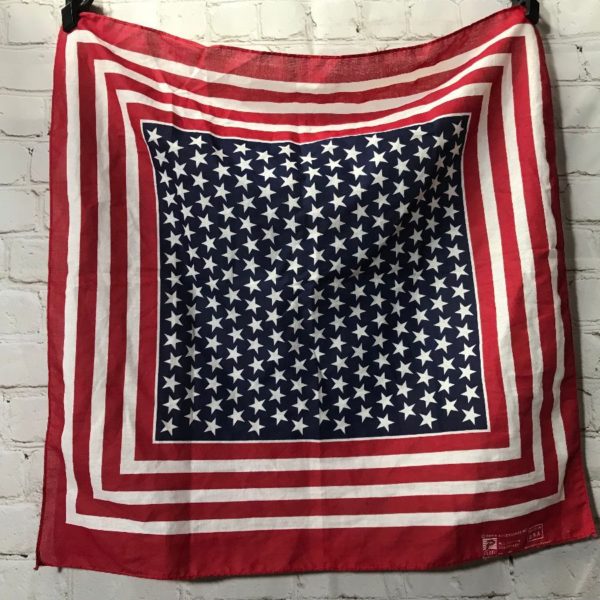 Bandana, cotton, American flag style design, square pattern with stars in center and surrounded by stripes, red/white/blue