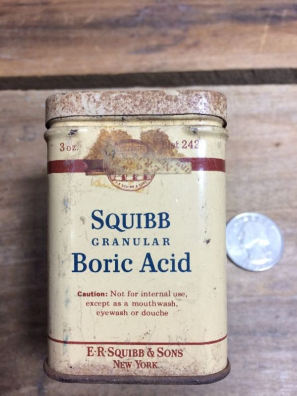 Antique Squibb metal container, Granular boric acid tin, beige/burgundy/blue, size 2.5″L x 2.25″W x 1.66″D As is