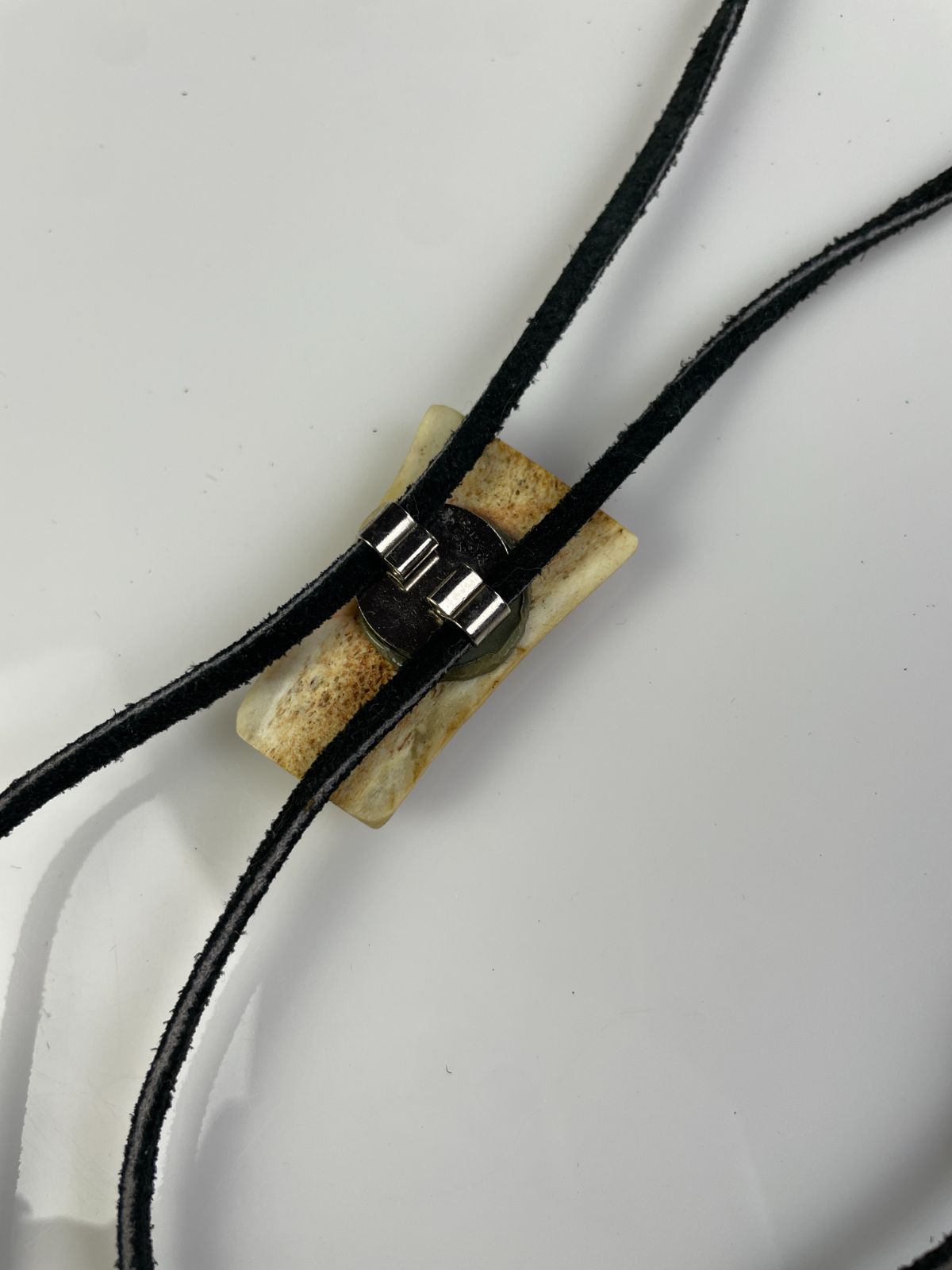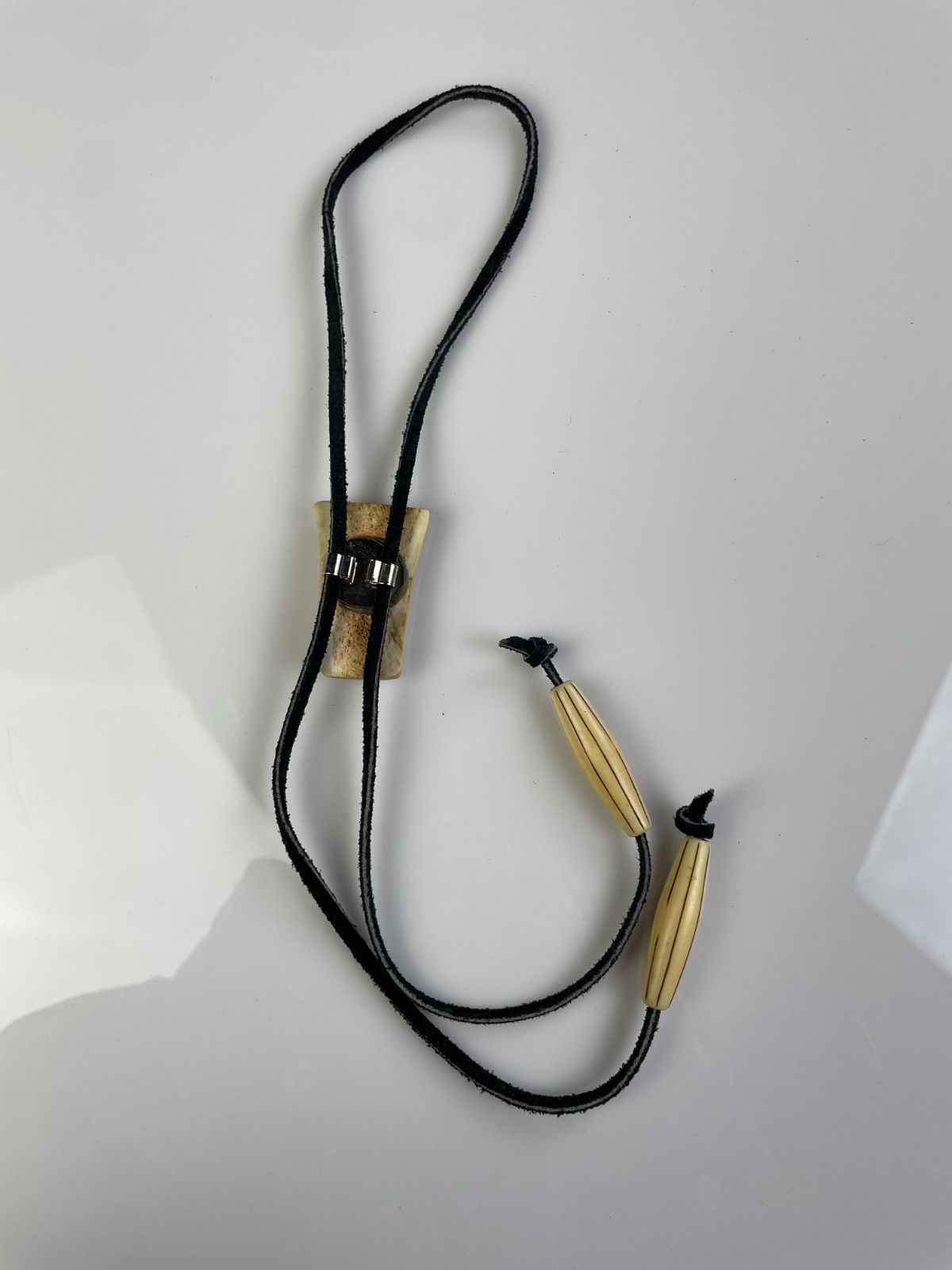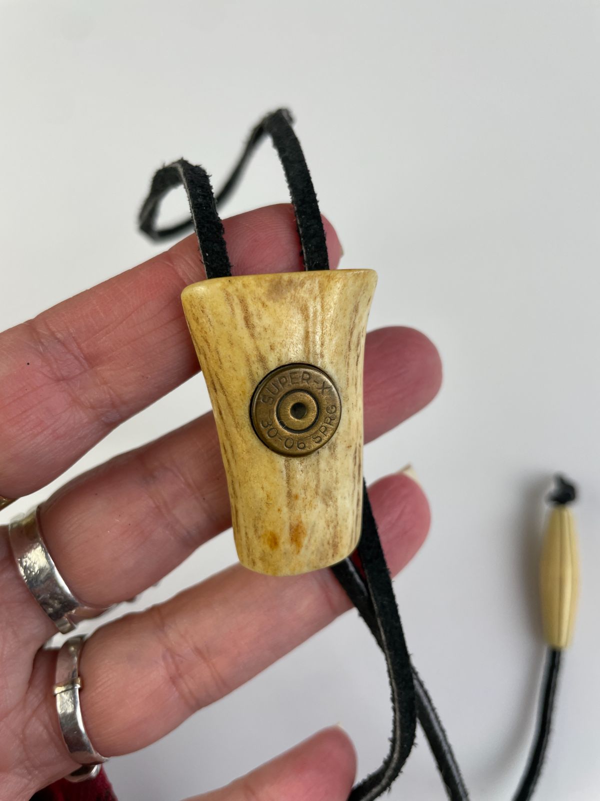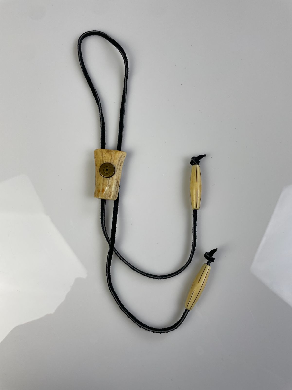 ANTLER & BULLET CASING BOLO TIE, SUEDE CORD, BEADED ENDS