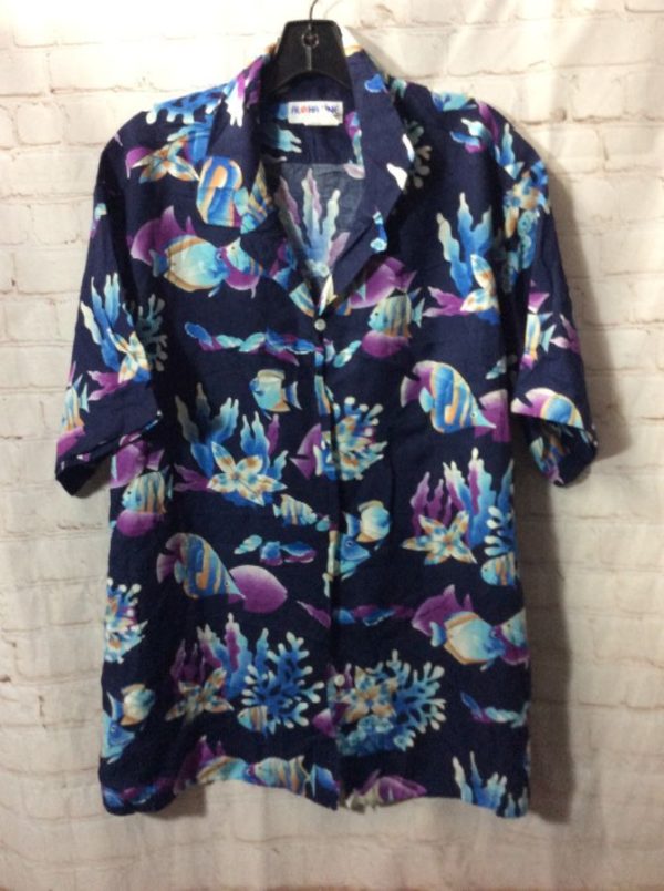 Aloha Line Hawaiian shirt, cotton, short sleeves, button-up, tropical fish & coral print, purple/blue/navy blue/white, size XL