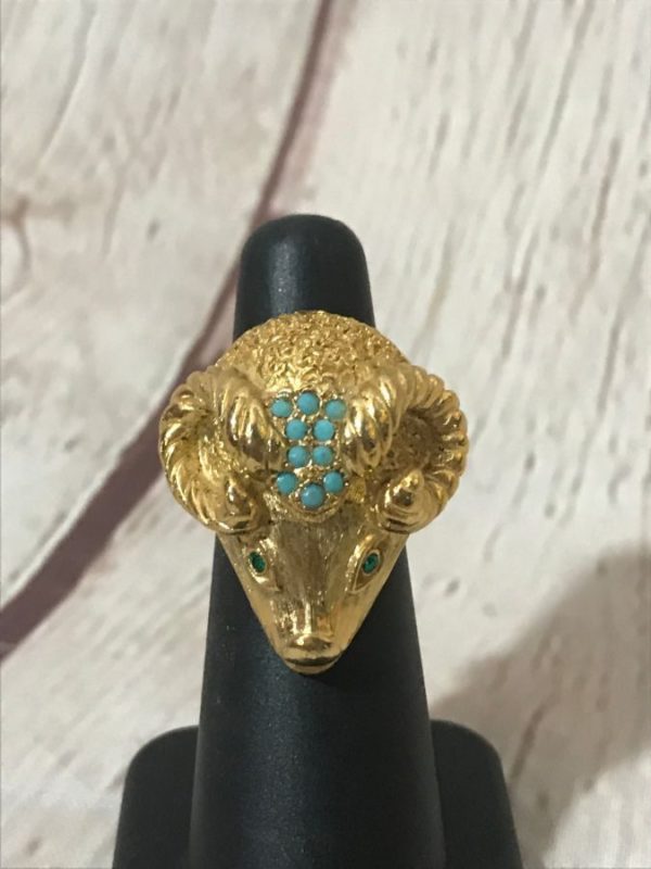 Ring, Aries astrological sign, Ram head, basic shank, inset stones in eyes & on forehead, dead-stock, gold/turquoise/green