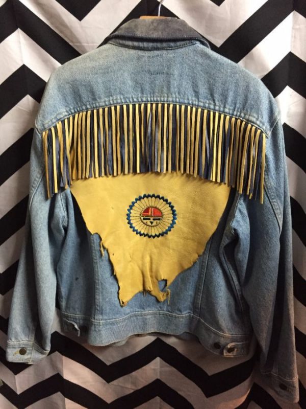 Denim jacket, Artisan made, button-up, suede leather back panel with Zuni sun design, suede fringe trim, medium blue/tan, size M