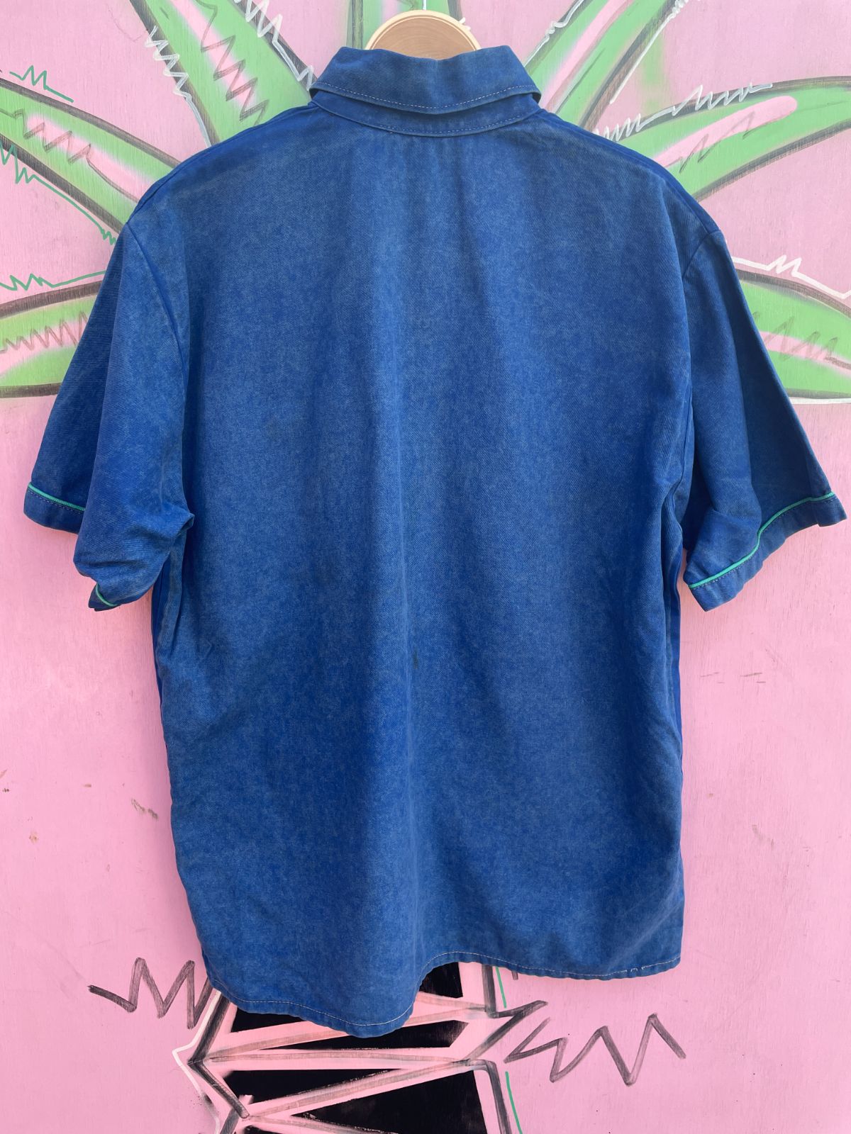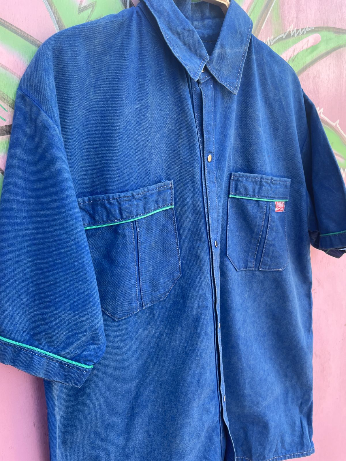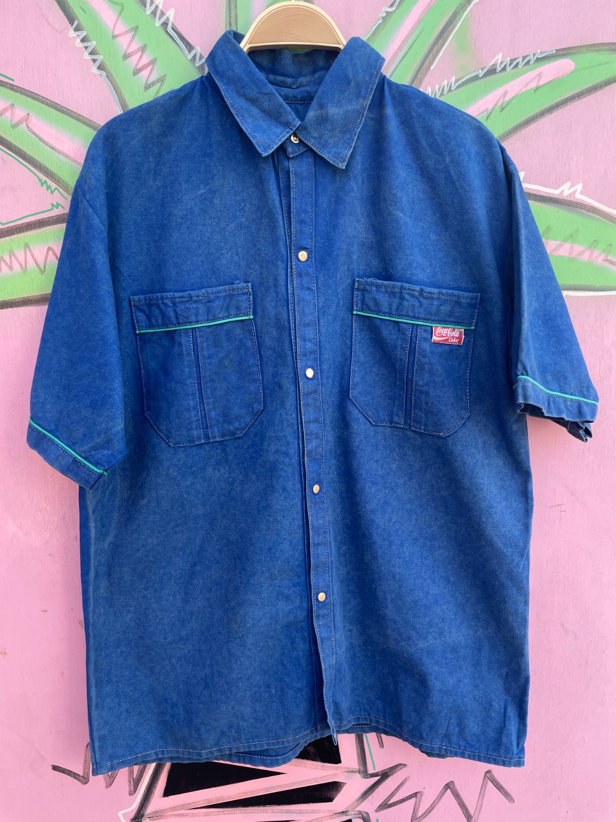 *AS-IS* COOL! 1990S BOXY COCA-COLA BRANDED MARBLE WASH TWILL SHORT SLEEVE SNAP BUTTON DELIVERY WORK SHIRT