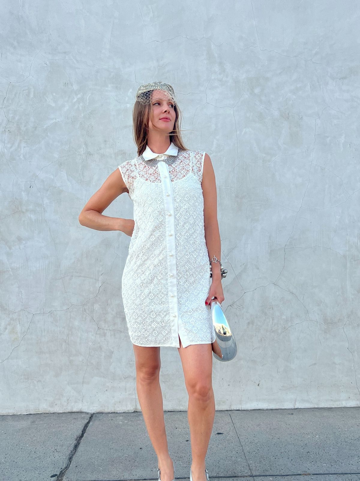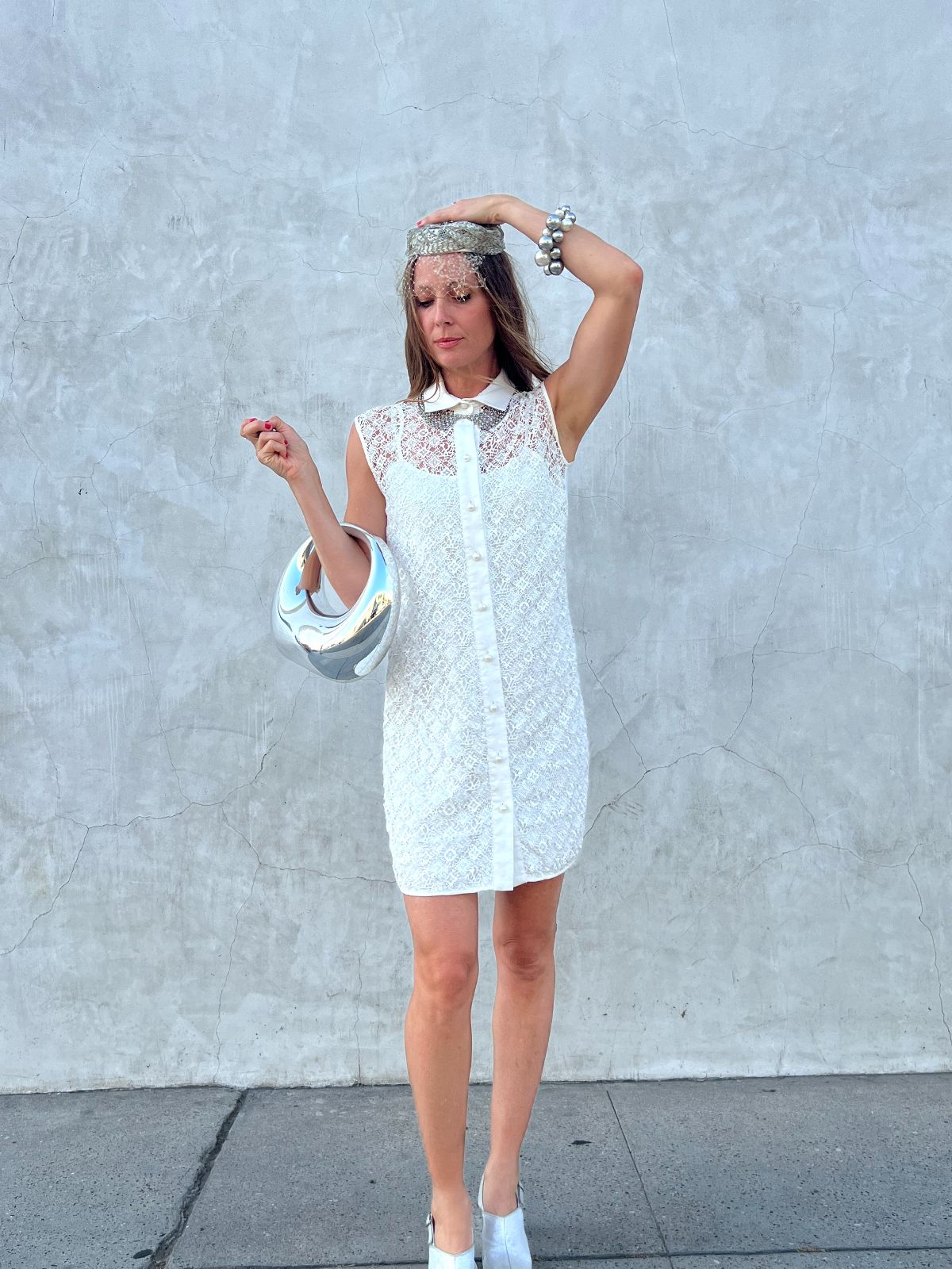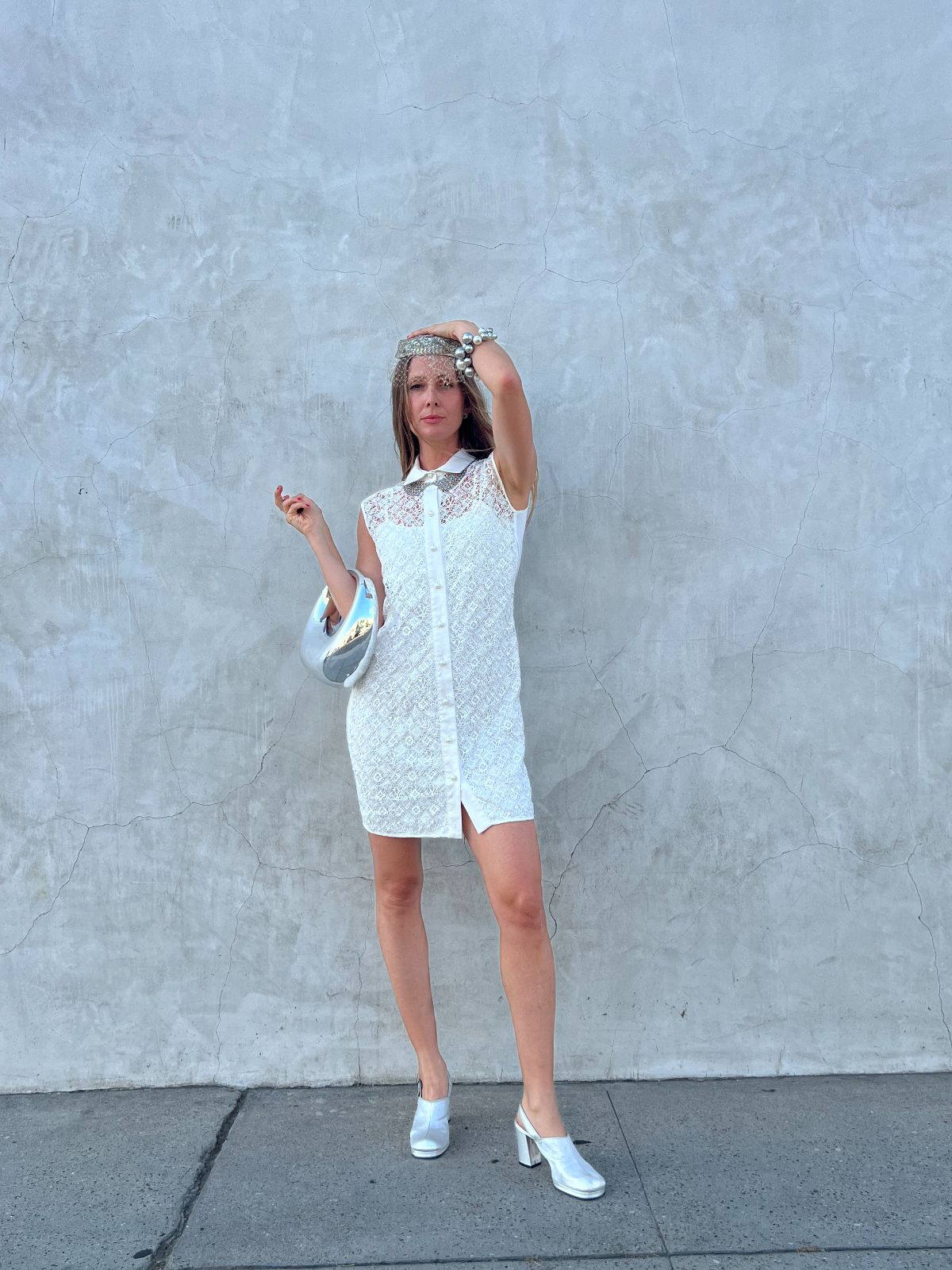 *AS-IS* CUSTOM LV MONOGRAM LACE SLEEVELESS SHIFT DRESS WITH PEARL BUTTONS