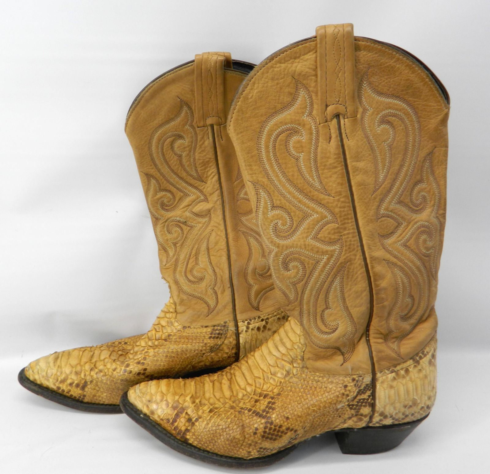 AS-IS GORGEOUS! AUTHENTIC PYTHON SNAKESKIN STACKED HEEL BOOTS, DECORATIVE STITCHING